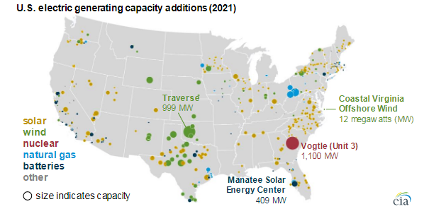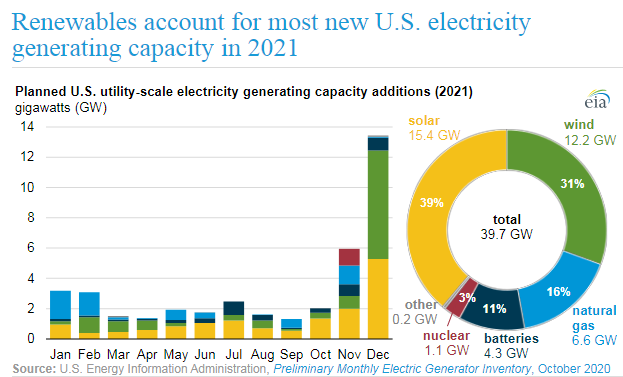 Em 2021, energia solar será responsável por 39% do total de nova geração de energia nos EUA. Energia solar liderará em 2021, respondendo por 39% da nova capacidade de geração de energia nos Estados Unidos. É seguida pela energia eólica ( 31% , 12,2 GW), gás natural ( 16% , 6,6 GW), armazenamento de bateria ( 11% , 4,3 GW), energia nuclear ( 3% , 1,1 GW) e outras fontes de energia (0,2 GW).